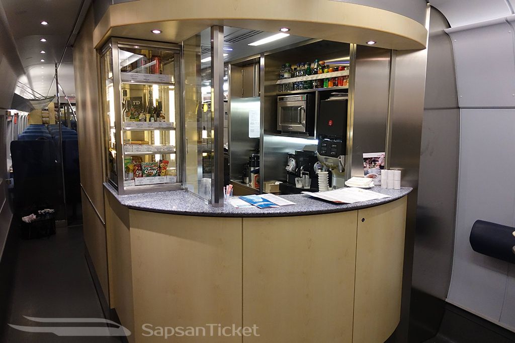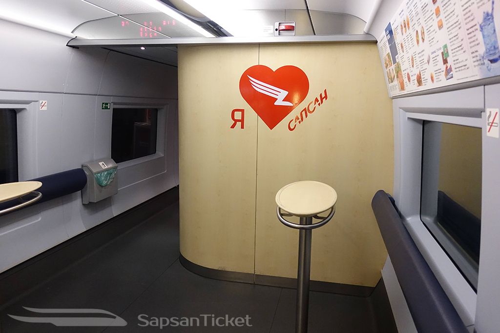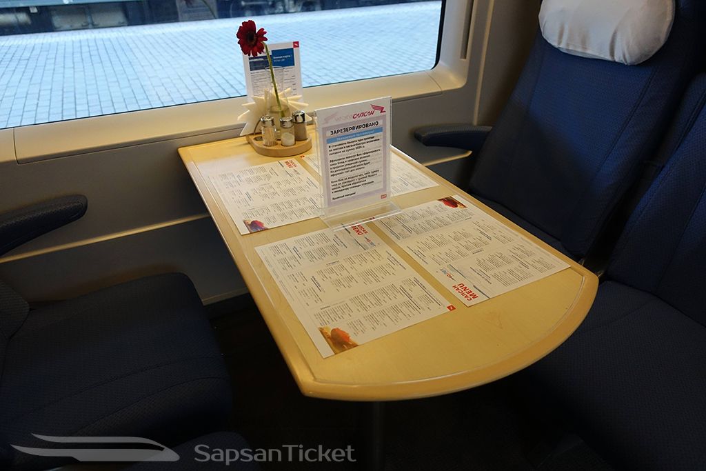 Also referred to as the Sapsan Restaurant Car, there is one on each train and features groups of four seats around a table. It’s the perfect place for socializing with friends, playing cards, or dining with the onboard menu of food and drinks.
